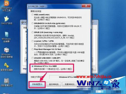 5、如果是舊版本的bootice軟件,XP選擇nt5.x,Win7選擇nt6.x,現在新版,nt5.x/nt6.x混在一起,統一選擇一項即可。選好后,按“安裝/配置”這個按鈕;