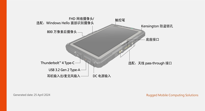 機身設計充滿了力量感和安全感。MIL-STD-810H 軍規認證 和 IP66 級別的防塵防水 是它的基本功。這意味著從1.8米的高度跌落、經受高壓水柱的沖刷,或是暴露在沙塵環境中,都無法對它造成實質性傷害。所有接口都有嚴密的防水蓋保護,機身四角包裹著厚實的減震材料,以平板計算機模式通過高達1.8公尺的防摔測試,并能夠在 -29°C 至 63°C (-20°F 至 145°F) 的操作溫度中運作,在各種情況下都能安心使用。這種可靠性和扎實的用料,是消費級產品無法比擬的。