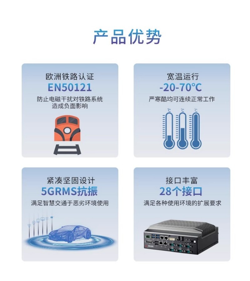 - 場景價值:智慧交通 ETC 車道中,4 個 GbE 網口可同時連接 4 路高清攝像頭,6 個 COM 口對接車道控制器和道閘,8 路隔離 DI/O 監控車輛檢測器狀態,無需額外擴展模塊,減少故障點。