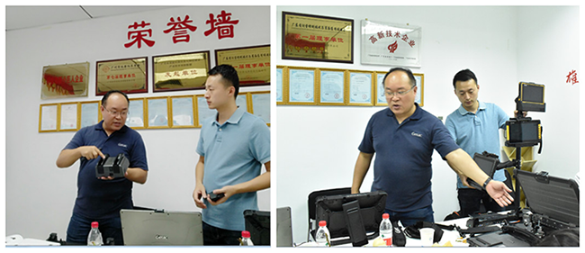 在擺滿Getac機具儀器的會議室里,在華頡技術部人員的協助下,陳總介紹了Getac最新軍用筆記本電腦產品的功能、特點和客戶加值服務的內容。并非常認真的為大家講解和演示各種加值產品的使用方法和特點。他強調,每一款產品都是針對不同行業市場,不同的應用而定制的,產品性能達到MIL-STD-810G美軍溫帶標準。