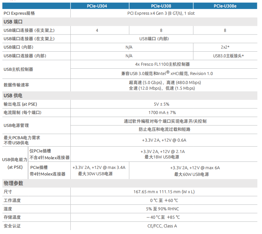 2、更可靠的設計。電源過電壓、過電流保護;USB電源開/關,可編程控制USB電源, 用于USB 3.0攝像頭恢復;每個端口的USB電源容量高達7.5W, 總功率為60W(PCIe-U308);工作溫度從0°C到+60°C(32°F到140°F)。