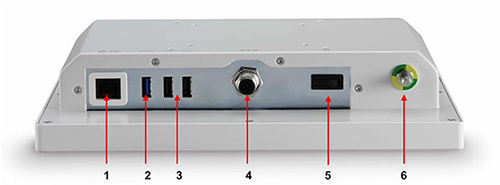 1. 局域網端口 2. US B3.0端口 3. US B2.0端口 4. 電源12VDC 5. 備用按鈕 6. 病人電位均衡連接針(POAGS6) |