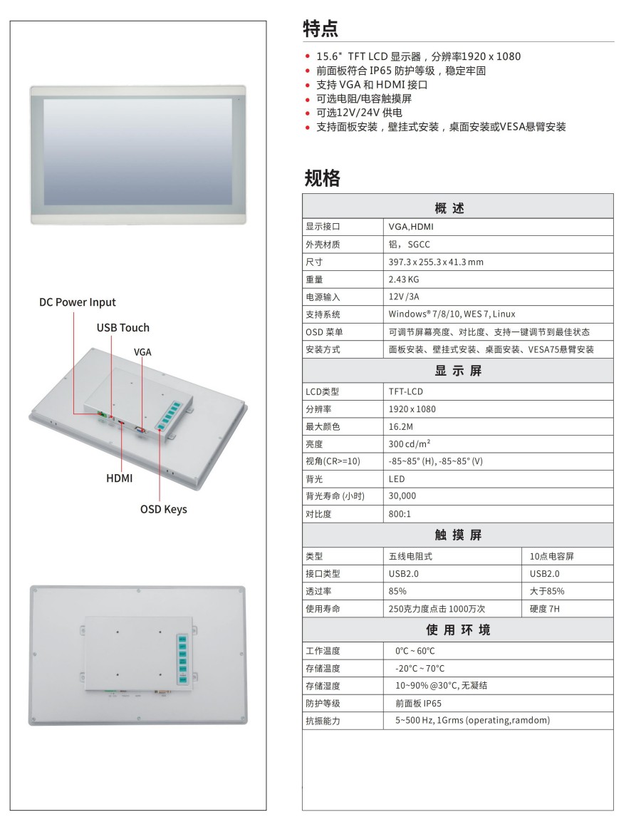 ?15.6" TFT LCD 顯示器,分辨率1920 x 1080 ?前面板符合 IP65 防護等級,穩定牢固 ?支持 VGA 和 HDMI 接口 ?可選電阻/電容觸摸屏 ?可選12V/24V 供電 ?支持面板安裝,壁掛式安裝,桌面安裝或VESA懸臂安裝